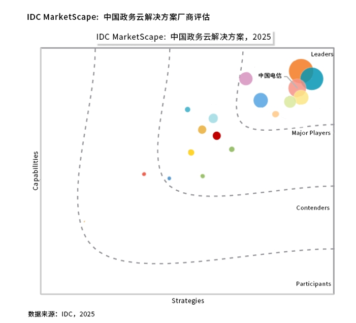 近日,国际数据公司(IDC)发布的《IDC MarketScape:中国政务云解决方案2025年厂商评估》报告显示,中国电信天翼云在该项评估中位列领导者象限,持续领跑政务云市场。