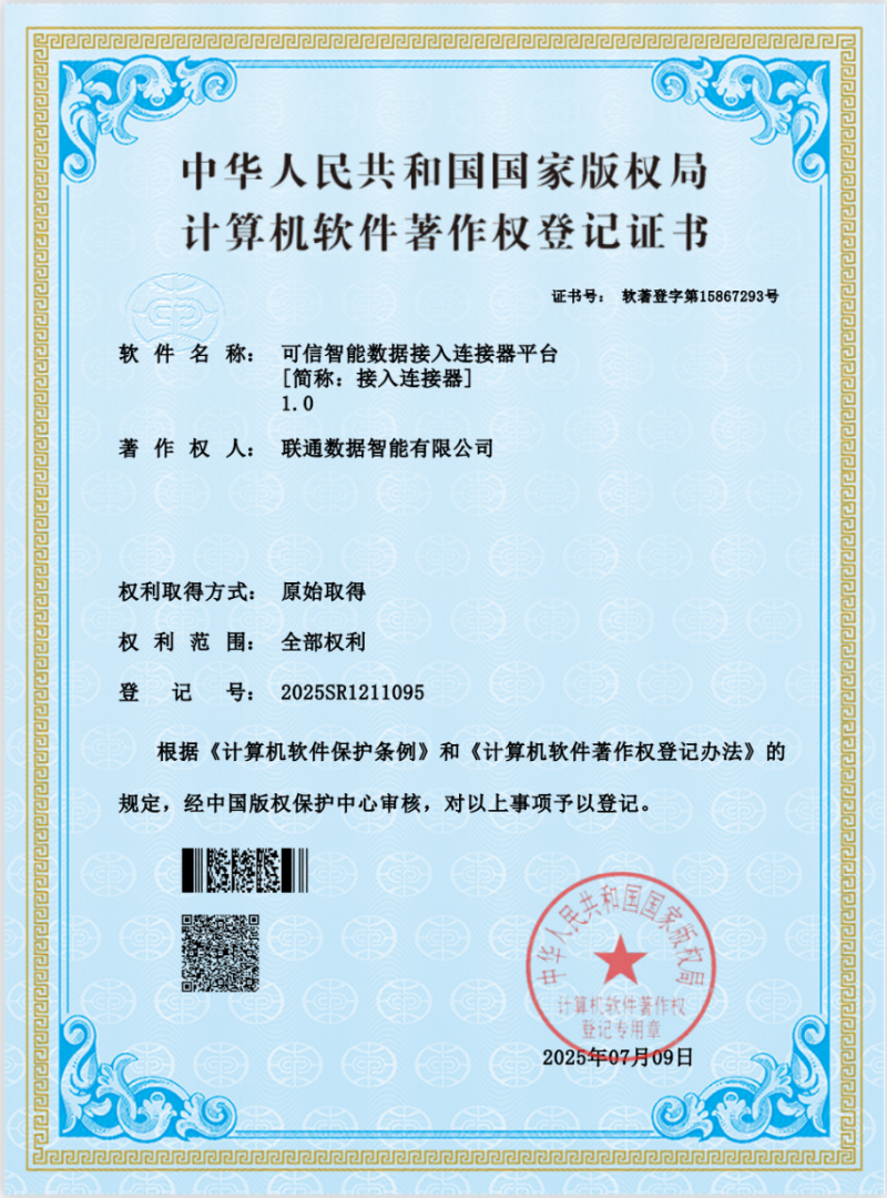 为贯彻落实国家关于建设和运营国家数据基础设施的部署要求,联通数智结合国数局印发技术文件标准与项目实施经验,建设成一套可落地、兼容性强的数据基础设施产品-接入连接器。近日,接入连接器产品已取得计算机软件著作权登记证书,以联通数智自主创新技术,为构建横向联通、纵向贯通、协调有力的国家数据基础设施提供动力。