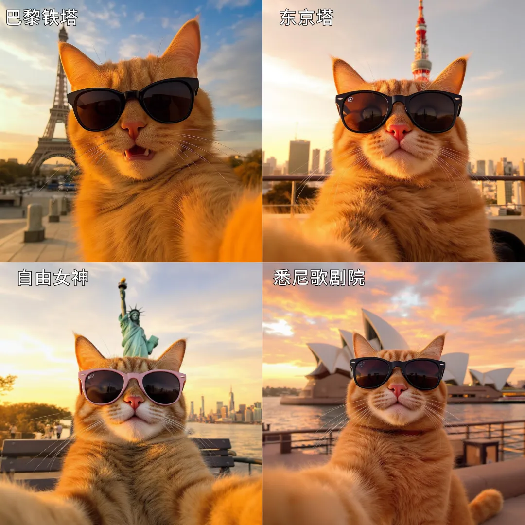 现在,你的笔记本也能轻松生成在自媒体上爆火的萌宠自拍图像,比如让一只橘猫去巴黎旅行: