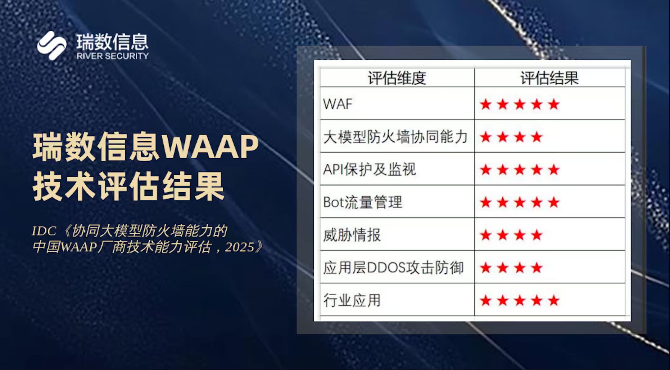 本次评估报告中,瑞数信息WAAP安全平台表现亮眼,在WAF、API保护及监视、Bot流量管理、行业应用等多个维度获得满分五星评价!这是继2024年评估后,瑞数信息WAAP安全平台再度获得IDC的高度认可。