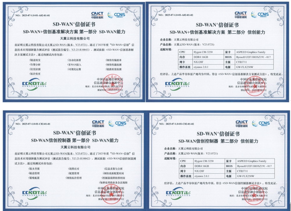 近日,天翼云科技有限公司“天翼云SD-WAN”顺利通过中国信息通信研究院(以下简称“中国信通院”)“SD-WAN⁺信创”项目评估,在“SD-WAN+信创基准解决方案”“SD-WAN信创控制器”及“SD-WAN信创网关设备”三大核心模块的评估中表现优异,成为国内首批通过该系列认证的云服务商。这标志着天翼云在SD-WAN信创领域的技术成熟度、安全可靠性及专业能力获得了行业权威认可,为构建自主可控、安全可靠的数字基础设施提供了坚实支撑。