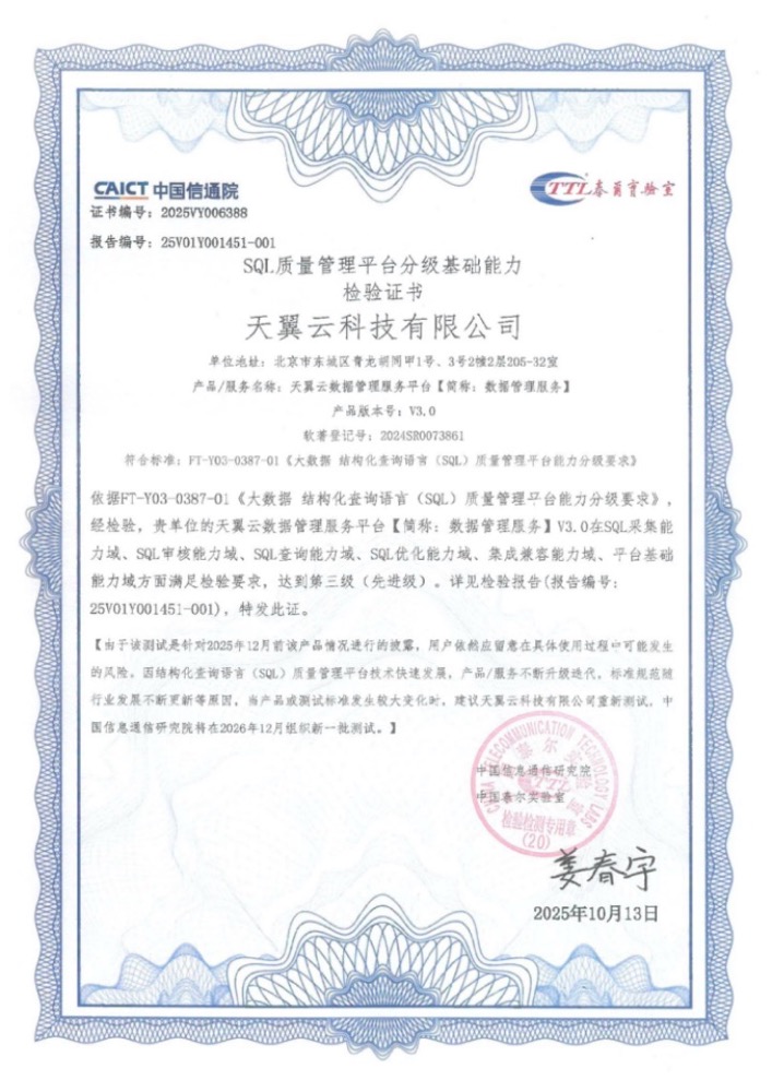 本次通过先进级评测,充分体现了天翼云TeleDB数据库在SQL质量管理与技术支撑方面的领先能力。天翼云TeleDB数据库以稳定可靠的数据库内核、卓越的查询优化性能和完善的生态兼容性,为企业在数字化转型中提供高标准、高性能的数据管理基座,助力企业构建安全、高效、规范的数据库管理体系,护航企业行稳致远。