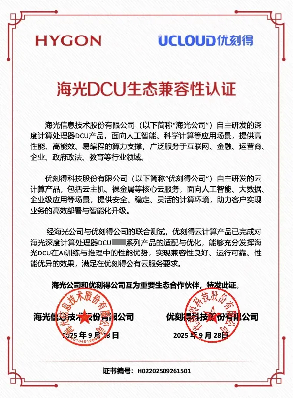 在此前合作中,优刻得已与海光信息正式达成重要生态伙伴认证。经双方联合测试与验证,优刻得已完成对海光深度计算处理器DCU系列产品的适配与优化,能够充分发挥海光DCU在AI训练与推理场景下的性能优势,实现良好的兼容性、稳定性与可靠性,整体性能表现优异,满足优刻得公有云服务的相关技术与运营要求。
