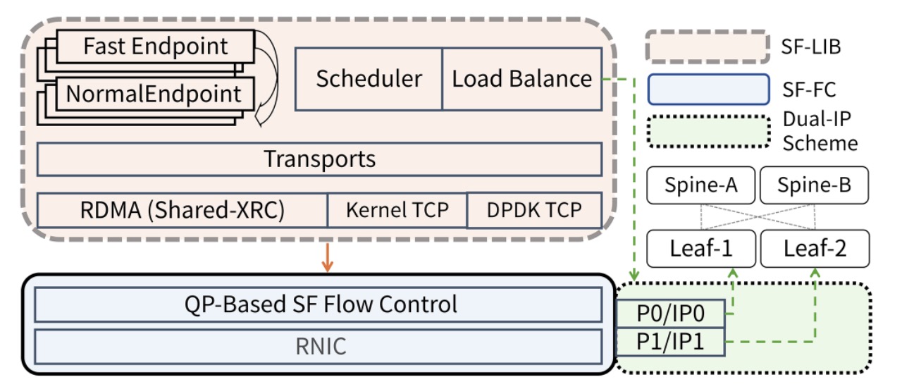 《SF-STACK: Streamlining RDMA for Heterogeneous Telecom Storage》的核心成果——自研SF-STACK超融合协议栈,是天翼云紫金智算网络技术实力的集中体现。该成果的诞生,离不开天翼云对电信级存储集群的深度洞察:当前智算分布式存储场景中,网络配置异构、管理权限分散等问题,已成为高性能网络(RDMA、远程直接内存访问)技术规模化部署的关键挑战。