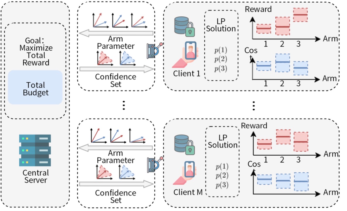 《Budget-Constrained Federated Bandits for Mobile Applications》,则聚焦智算网络跨域协同的核心痛点。针对分布式学习中“资源受限、数据隐私保护”的双重需求,天翼云首次将带预算约束的线性老虎机模型引入联邦学习,提出高效算法FedUCBwK。