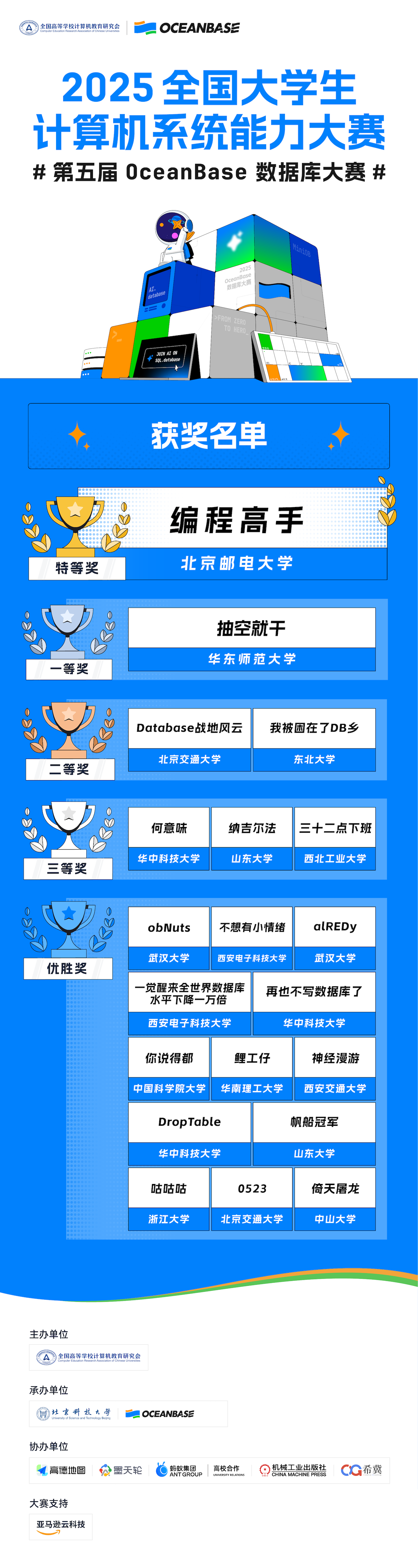 1月18日下午,2025年全国大学生计算机系统能力大赛暨第五届OceanBase数据库大赛在北京科技大学落幕。本届赛事吸引全国高校的1223支队伍、2620名学生参赛。经过两个多月比拼,北邮「编程高手」队凭借在数据库内核优化与AI应用开发中的综合表现,夺得冠军及10万元奖金。