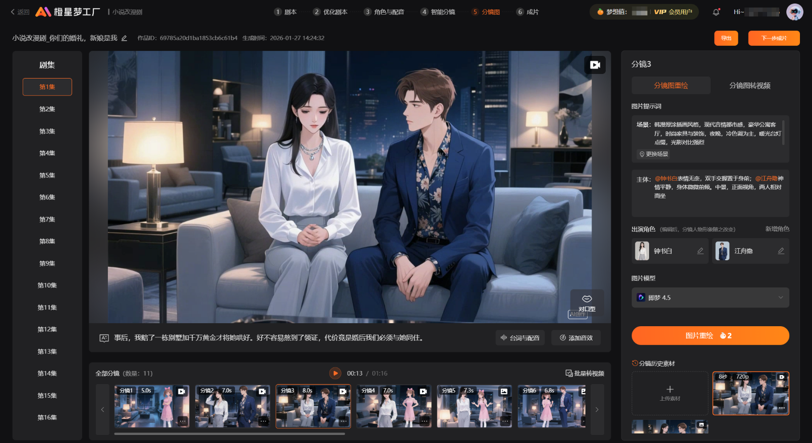 创作效率升级:通过对豆包向量模型、知识库等技术的应用,橙星梦工厂整合海量精品小说剧本库、IP素材库,实现分镜生成精准匹配影视级规范、角色设计自适应场景需求,彻底解决多工具切换的繁琐痛点,大幅提升生产效率。