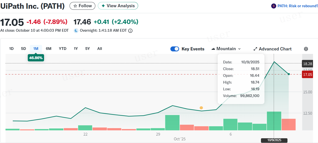 当UiPath的股价在两周内飙升近50%,创四个月新高时,整个科技圈都在追问:这家全球RPA(机器人流程自动化)巨头,凭什么突然被资本疯抢?答案就藏在它与OpenAI、NVIDIA的深度合作里。