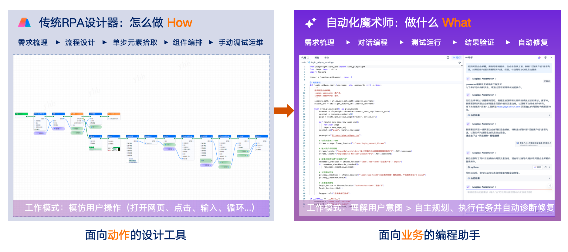 艺赛旗的Magical Automator(自动化魔术师),直接把设计逻辑从“怎么做(How)” 改成了“做什么(What)”,业务人员只需要说需求,AI帮你生成流程、自动修复问题。