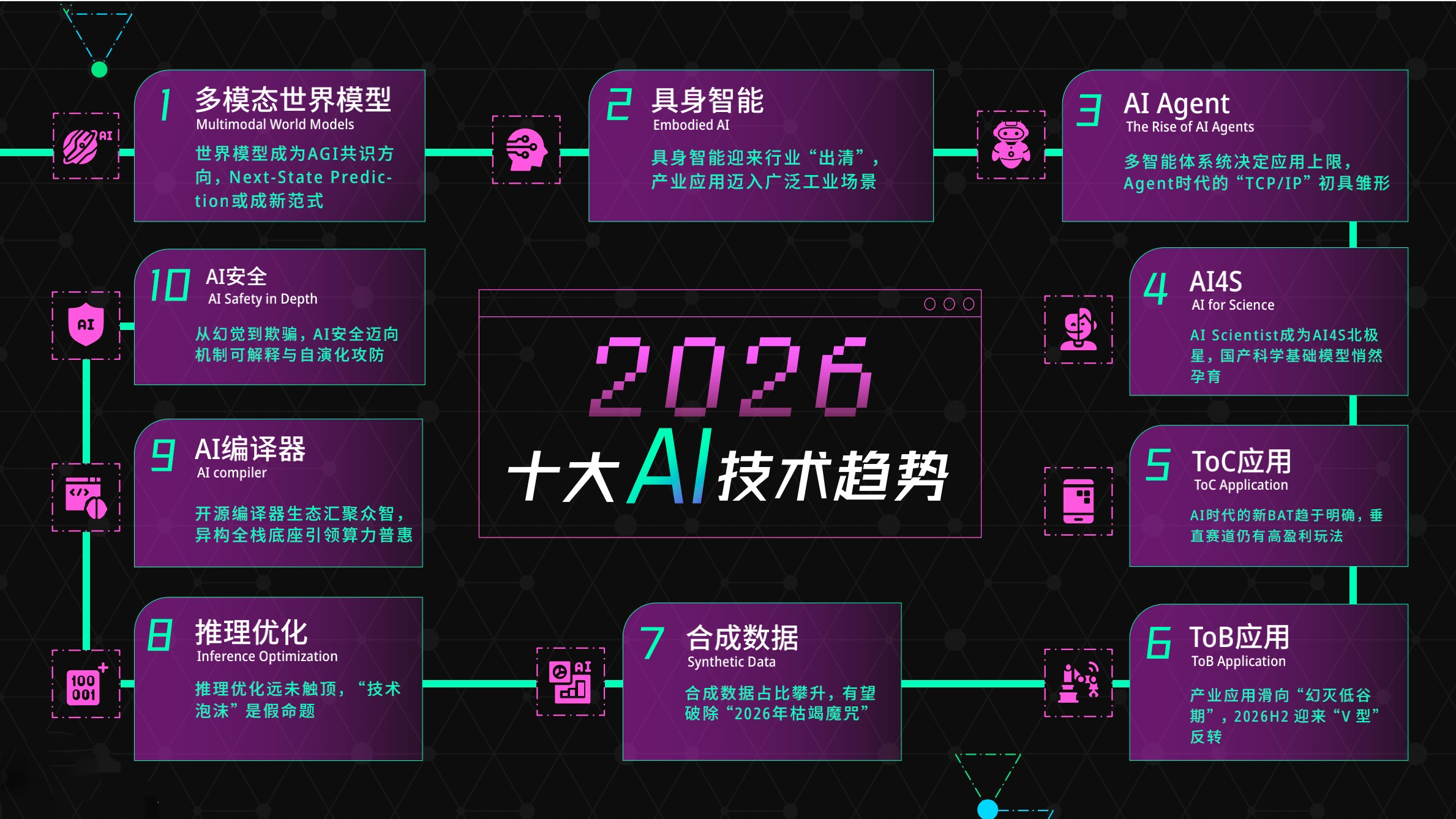 同时,北京智源人工智能研究院发布《2026十大AI技术趋势》,明确指出AI发展的核心转变:从“预测下一个词”的语言游戏,迈向“预测世界状态”的物理规律探索。