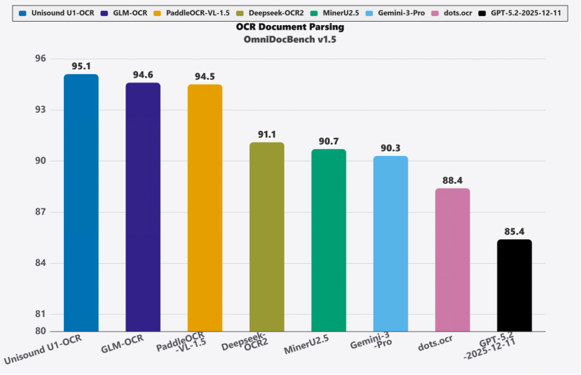 图1Unisound U1-OCR在OmniDocBench V1.5的评测得分对比