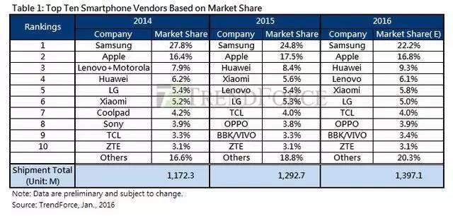 从2015财年全球智能手机出货量来看,华为和小米都分别超越联想,成为世界第三和第四的手机品牌。