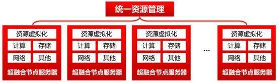 超融合架构是一种新型的IT基础架构,以x86服务器作为基础单元,通过软件定义,由单一供应商进行软硬件集成、优化和预装,在每一个服务器节点内紧密集成计算、存储、网络、虚拟化等技术,多台超融合节点通过网络实现并联,通过统一界面对其中的软硬件资源进行管理,实现管理简化,充分解决软硬件兼容性,可横向线性扩展,可实现一体化交付,整体在逻辑上类似于一个“盒子”。