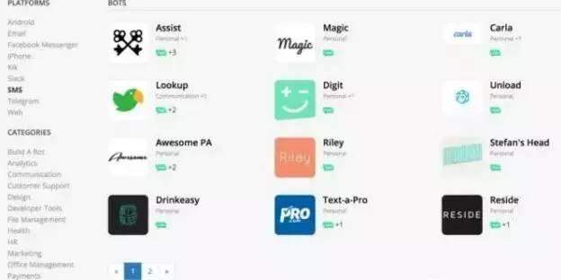 随着bot的数量越来越多,立马就有创业者灵机一动,干脆建了一个机器人应用市场Botlist,核心想法是提供一个集合众多应用的目录。自botlist网站发布后,目前已经列出了近400个机器人应用,包括Slack、Telegram、Kik等服务,涉及短信、iOS、Android、电子邮件和网页等多个平台。
